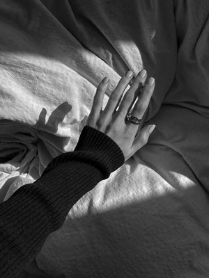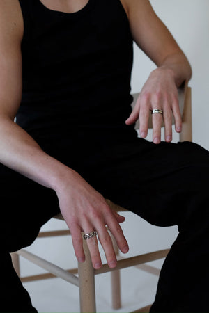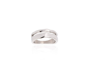 ÓMA hringurinn er hannaður sem tvöfaldur hringur með bylgjóttri, glansandi áferð. Hann fer vel í bland með hringum úr öðrum línum og er fullkominn fyrir öll kyn.